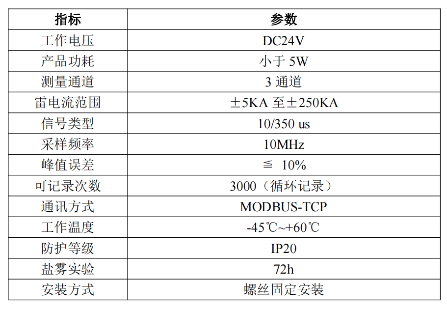 ZPTOMD1907-T型雷電在線監(jiān)測裝置是一種實時采集3路雷電流數(shù)據(jù)并具有通信功能的裝置,我公司具備該裝置的自主知識產(chǎn)權(quán)。裝置主要包含3 個雷電流傳感器、1個主機組成。該裝置可用于浪涌保護器、避雷針等其他設(shè)備。當監(jiān)測點遭受雷擊時,裝置可實時記錄監(jiān)測點遭受的雷擊數(shù)據(jù),雷擊數(shù)據(jù)包括:記錄雷擊發(fā)生時間、雷電流幅值、雷電流極性、雷擊次數(shù)。裝置將處理好的雷擊數(shù)據(jù)進行本地存儲并通過MODBUS-TCP通訊方式輸出給后端modbus master。