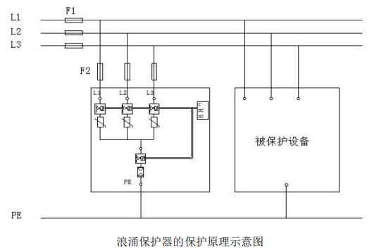 交流浪涌保護(hù)器用于交流電源的第二級(C 級)雷電過電壓保護(hù),三相浪涌保護(hù)器采用-3防護(hù)電路,如下圖所示。