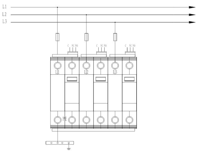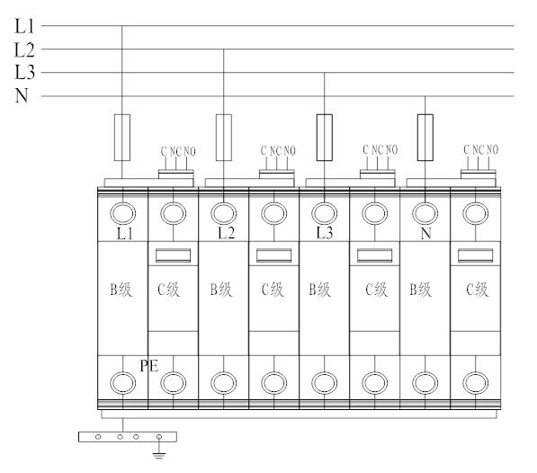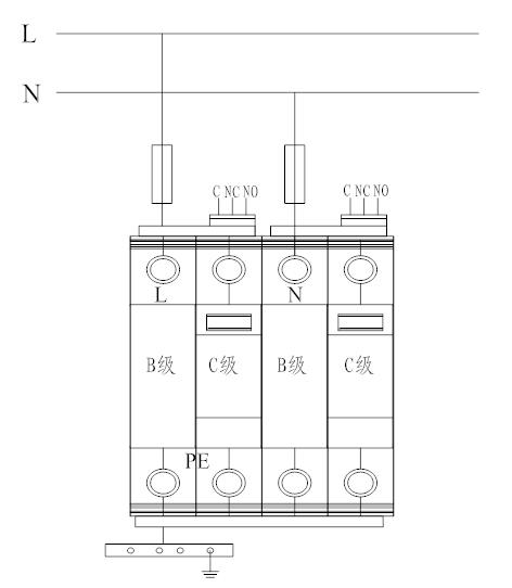 5.3 電源相線(L)、零線(N)分別接入電涌保護器相應接線端子,保證牢固及可靠,將電涌保護器接地端與地線作良好電氣連接。