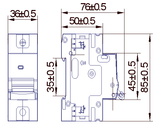 產(chǎn)品采用 35mm 標(biāo)準(zhǔn)導(dǎo)軌安裝,單模尺寸為:76×85×36(mm,未標(biāo)注公差:±0.5mm。如下列圖所示(單位:mm)